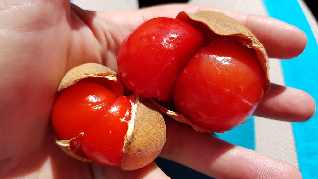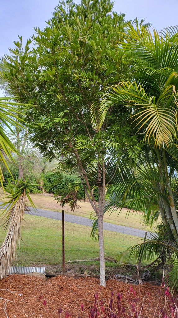 I planted tube stock in 2015 and as you can see it is growing quite well – at least 4 to 5 metres now but has yet to fruit. I expect it to reach 10 metres and it is already producing wonderful shade.